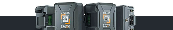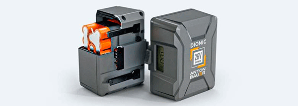 DIONIC 26V. Diseñados para dispositivos de alto consumo, los sistemas de batería DIONIC 26V Gold Mount Plus y B-Mount son una solución dedicada para alimentar los equipos de producción de alto rendimiento necesarios para cumplir con los exigentes estándares cinematográficos actuales. Una batería nativa de 26 V con 12 A de CC proporciona más de 300 W de potencia constante, lo que significa que puede usar paneles LED de gran tamaño durante más tiempo, produciendo horas de iluminación creativa de máxima intensidad o alimentando cámaras de cine de alta velocidad y alto consumo.