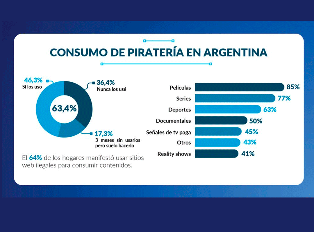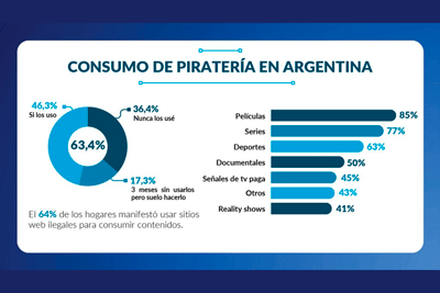 El informe Internet Index publicado por Cabase, entidad que nuclea a empresas proveedores de internet de la Argentina relevó la situación del país en torno al consumo de piratería: el 63 % de los hogares manifestó usar sitios web ilegales para consumir contenidos, reflejando un nivel de piratería particularmente elevado.