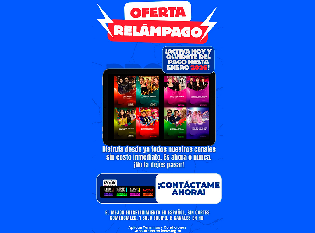 Latin Entertainment Group presentó al mercado bajo el título Oferta Relámpago, propuesta que permite que quienes la acepten y activen sus canales incluidos dentro de 8Pack Premium, no tendrán que pagar ningún costo hasta fin de año.
