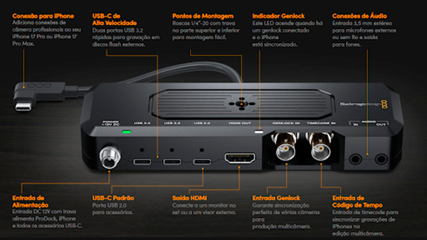 El Blackmagic Camera ProDock transforma el iPhone 17 Pro y el iPhone 17 Pro Max en una cámara de producción profesional con todas las conexiones necesarias para crear un equipo personalizado. ¡También es compatible con la app Blackmagic Camera para iPhone! Tendrás conexiones para monitorización HDMI, micrófono, auriculares, genlock, USB para unidades externas y alimentación.