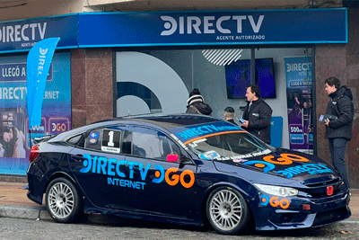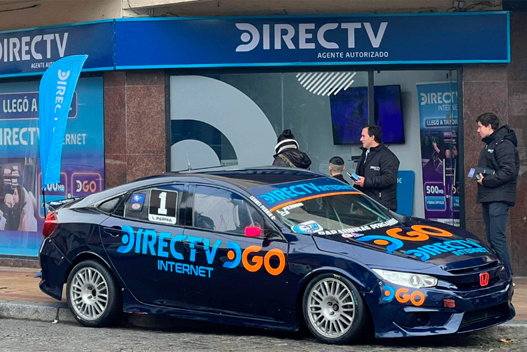 El piloto tandilense estuvo con uno de sus autos de carreras en la esquina de San Martín e Irigoyen, donde la compañía de medios y tecnología tiene su flamante local de comercialización de los servicios de conectividad y entretenimiento.