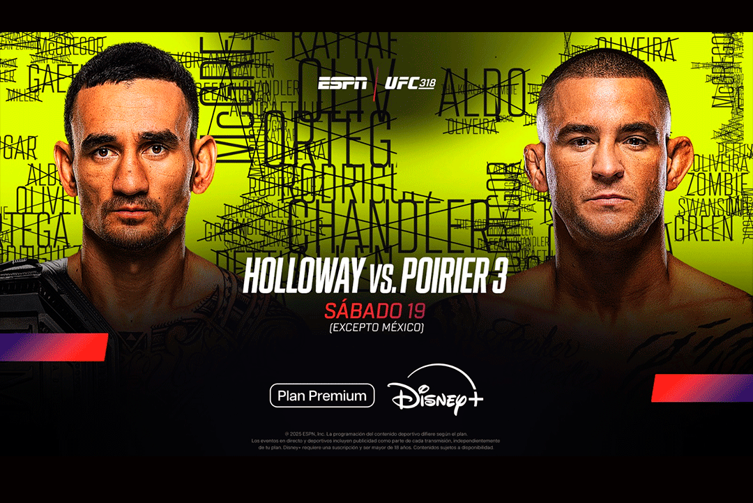Los legendarios y siempre espectaculares Max Holloway y Dustin Poirier se enfrentarán por tercera vez para encabezar un esperado UFC 318 en Nueva Orleans, en vivo por ESPN Knockout para los suscriptores del Plan Premium Disney+, con relatos y comentarios de Andrés Bermúdez, Ivette Hernández y Gastón ‘Tonga’ Reyno.